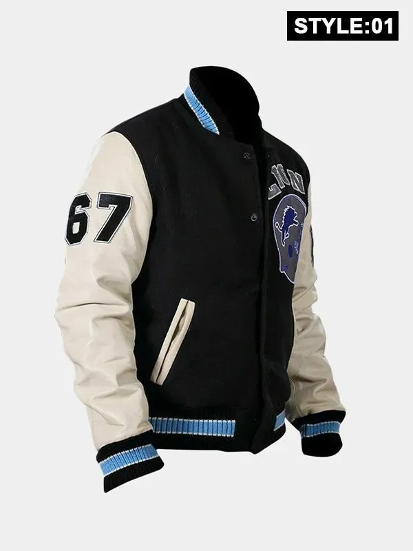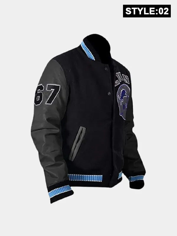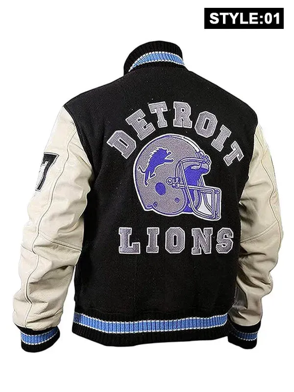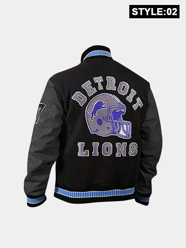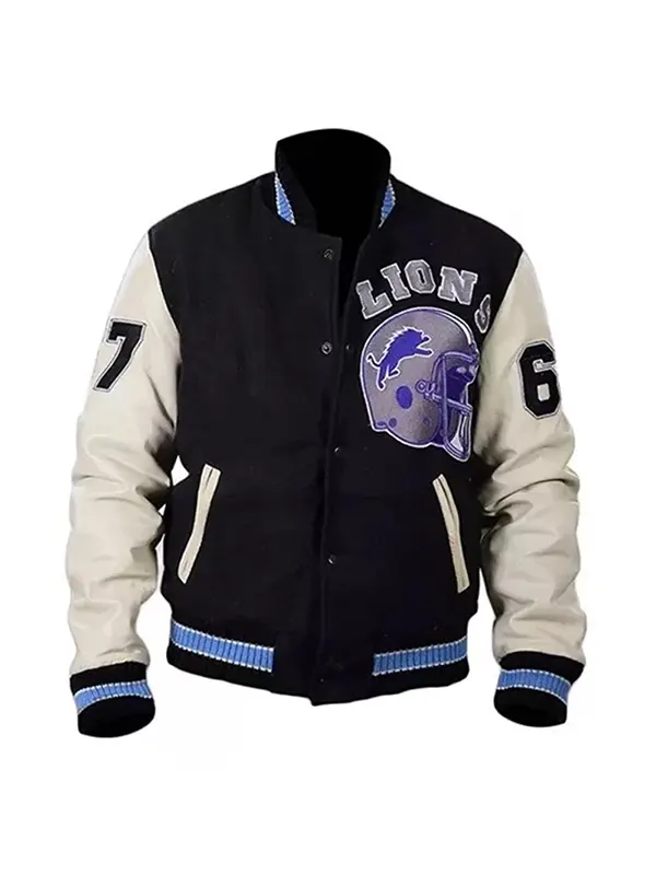 This Detroit Lions Letterman Jacket is made with a wool body and real leather sleeves for long-lasting durability and classic design. While the rib-knit collar and cuffs offer a snug and athletic fit, the soft viscose lining on the inside guarantees comfort for all-day wear. It is simple to wear and gives a dash of vintage elegance to any ensemble thanks to its traditional snap button-style front clasp. With two outside and two interior pockets, the jacket offers plenty space for you to store your necessities. Whether you are dressing like Axel Foley, going to a game, or just hanging out, the striking black and white color combination and Detroit Lions logo make it stand out. Ideal for anyone who enjoys retro sportswear with a Hollywood flair or for lovers of the Beverly Hills Cop franchise.