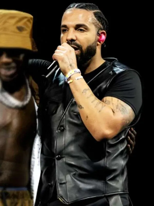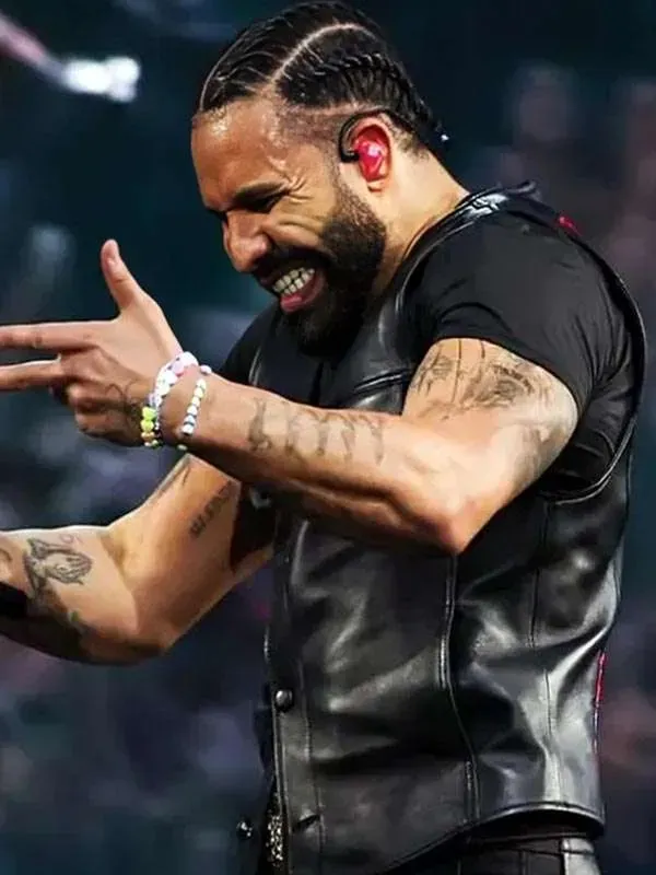 The Drake Wireless Festival Leather Vest combines traditional elements with a strong performance aesthetic, showcased in shiny black leather for a striking yet grounded effect. It is offered in both imitation and genuine leather. The outer layer features a clean, structured finish, while the inner lining is crafted from viscose fiber, providing a composed sensation for the wearer. The ornamental buttoned front lends a tailored touch to the style without compromising its smooth silhouette, and the dark hue enhances its versatility for various styles and occasions. Drawing inspiration from the on-stage vibe of the Wireless Festival 2025, the Drake Black Leather Vest embodies modest strength and control through its simple design.