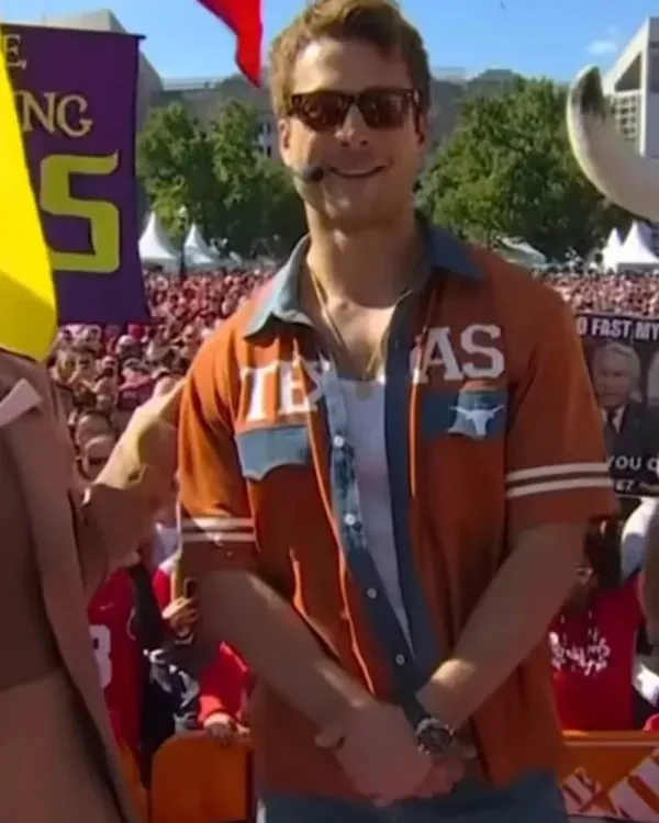 The Glen Powell Kristin Juszczyk Texas Longhorns Shirt is made from soft, breathable cotton fabric, ideal for everyday wear or game day. It features a button-style front closure and a classic shirt-style collar that adds a clean and polished look. The half-length sleeves make it perfect for warmer weather, while the two flap chest pockets add both style and function. The bold orange color proudly represents the Texas Longhorns spirit, making it a must-have for any fan. Pair it with jeans or shorts for a sporty, laid-back look that still stands out. This shirt blends comfort, celebrity fashion, and team pride all in one.
