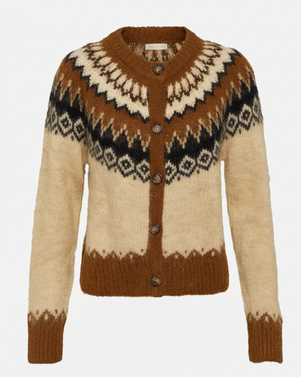 In 2024, no one wants the Kristen Bell television series. Joanne Cardigan instantly gives your persona a glamorous aesthetic and makes you stand out everywhere you go. It is painstakingly made from premium knit fabric and thoughtfully constructed to keep you warm and cozy in both formal and informal settings. It has a button closure to make it simple to put on and take off. The traditional elements that provide style and sophistication are the rib-knitted cuffs, full sleeves, and crew neck collar. The captivating print on this ostentatious brown and beige cardigan has the power to instantly draw attention and liven up your drab appearance. Fashionistas, make a bold fashion statement by adding this stylish item to your cart right away.