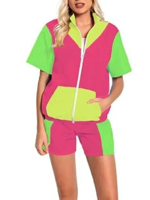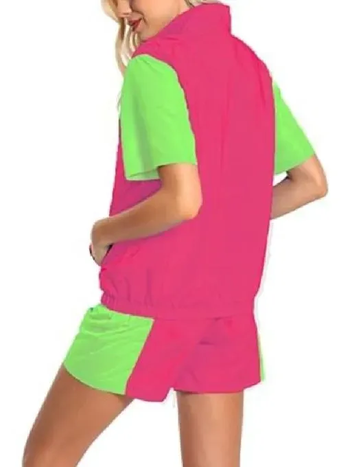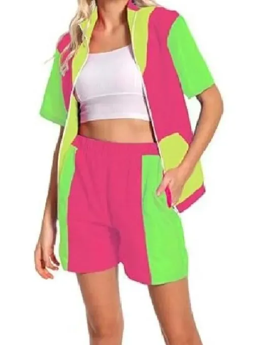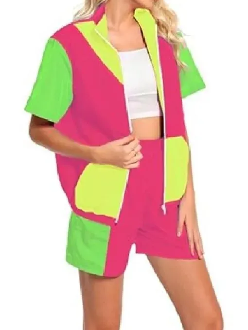 The jacket showcases a vibrant multi-color pattern crafted from soft fleece fabric, enhanced by a luxuriously smooth viscose lining for all-day comfort. The stand-up collar and front zippered closure provide a structured, sporty appearance, while the half sleeves contribute a unique, relaxed feel. Featuring two outer pockets and one inner pocket, this piece seamlessly blends style with practicality. The coordinating shorts carry on the colorblock theme, made from the same premium fleece material. Engineered for comfort and adaptability, they come with two side pockets, ideal for keeping your essentials within reach. Their lightweight, breathable design makes them perfect for casual outings, lounging, or outdoor escapades.